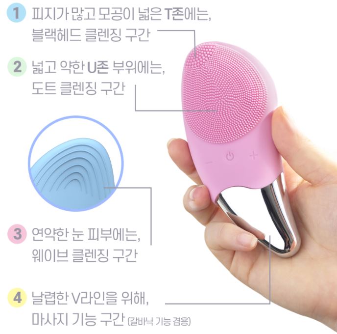 미엔느 진동클렌저는 위 사진과 같이 맨 위 돌기 부분은 피지가 많고 모공이 넓은 T존에