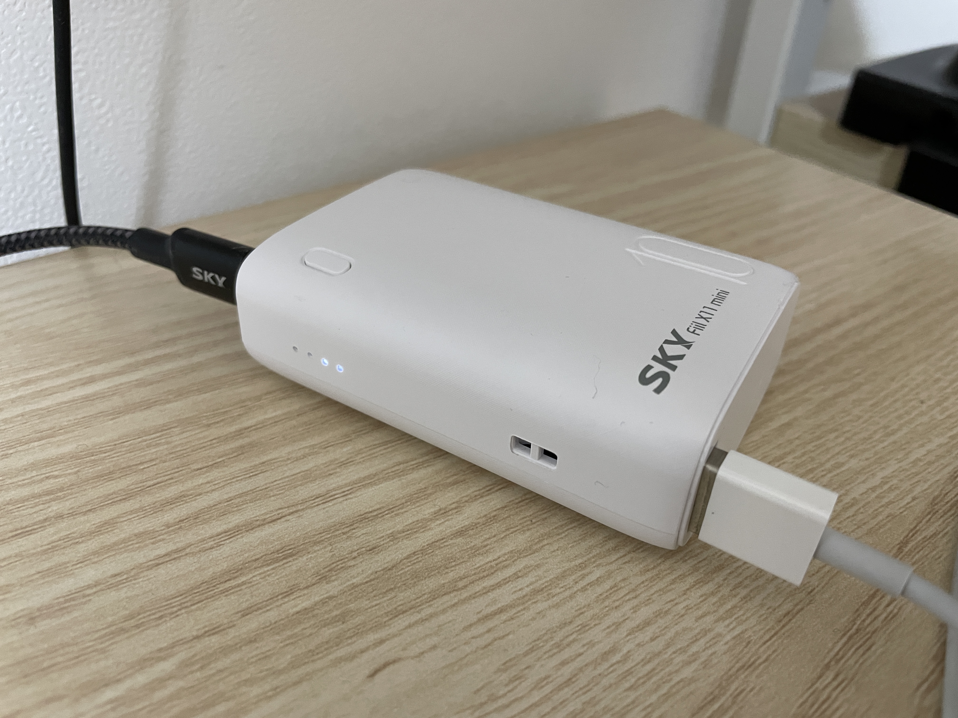 미니보조배터리를 충전하고 있는 상태입니다. 오른쪽은 충전하면서 아이폰을 충전하고 있는 모양이네요.