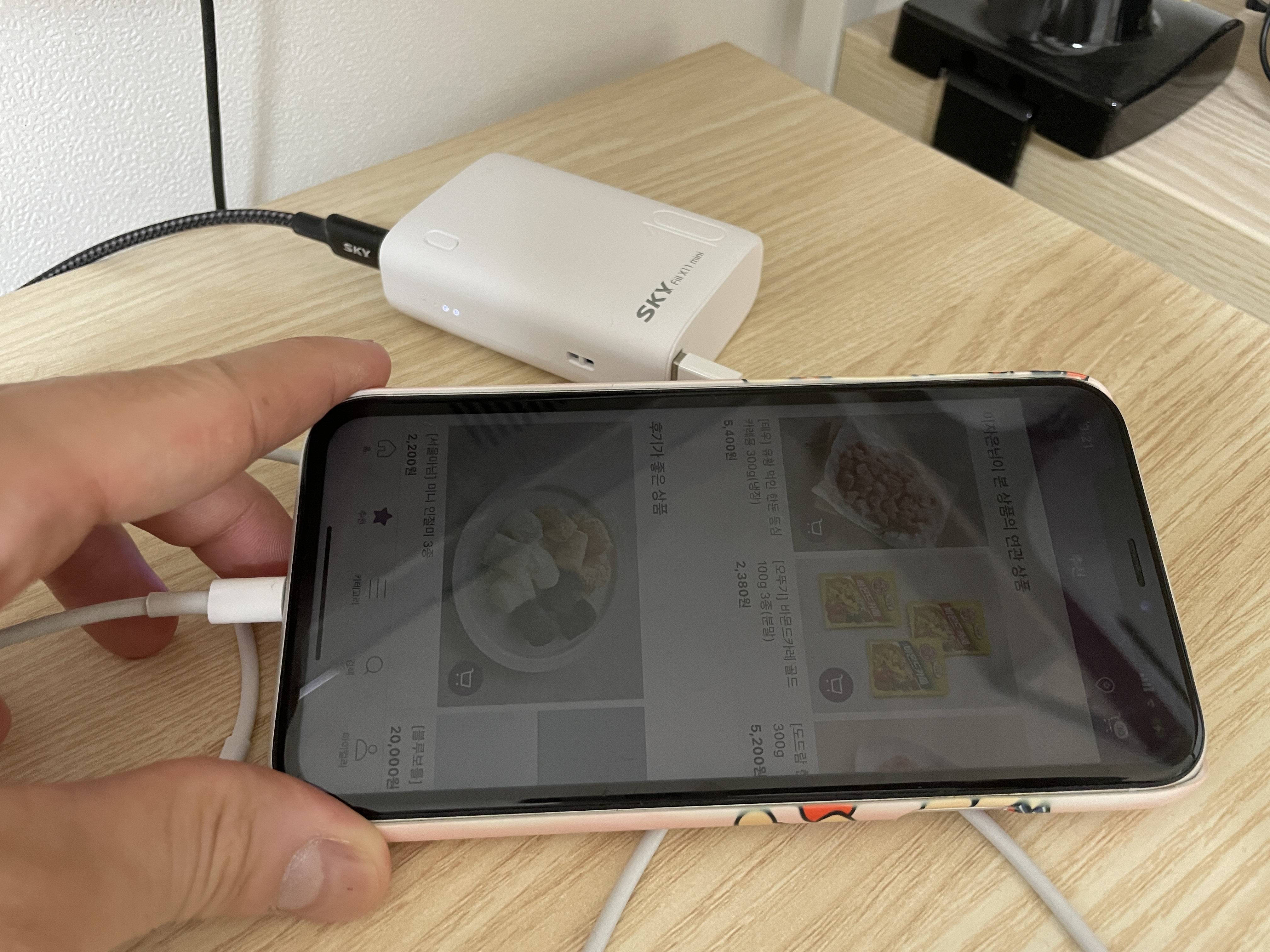 미니보조배터리를 충전하고 있는 상태입니다. 오른쪽은 충전하면서 아이폰을 충전하고 있는 모양이네요.