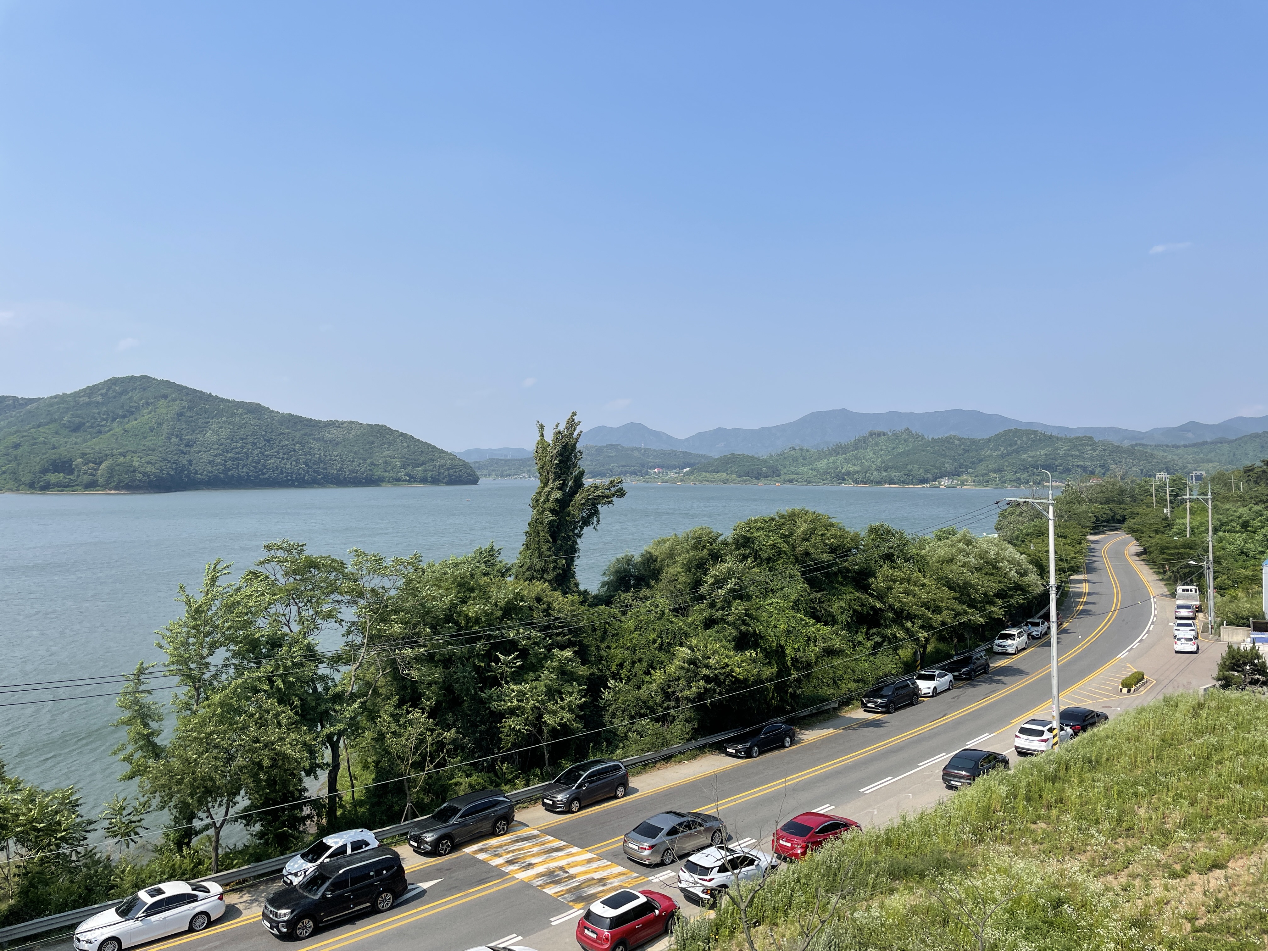2층 풍경으로 저희는 실내에 있었고 밖을 바라보면 이렇게 이동저수지가 한눈에 보입니다.
