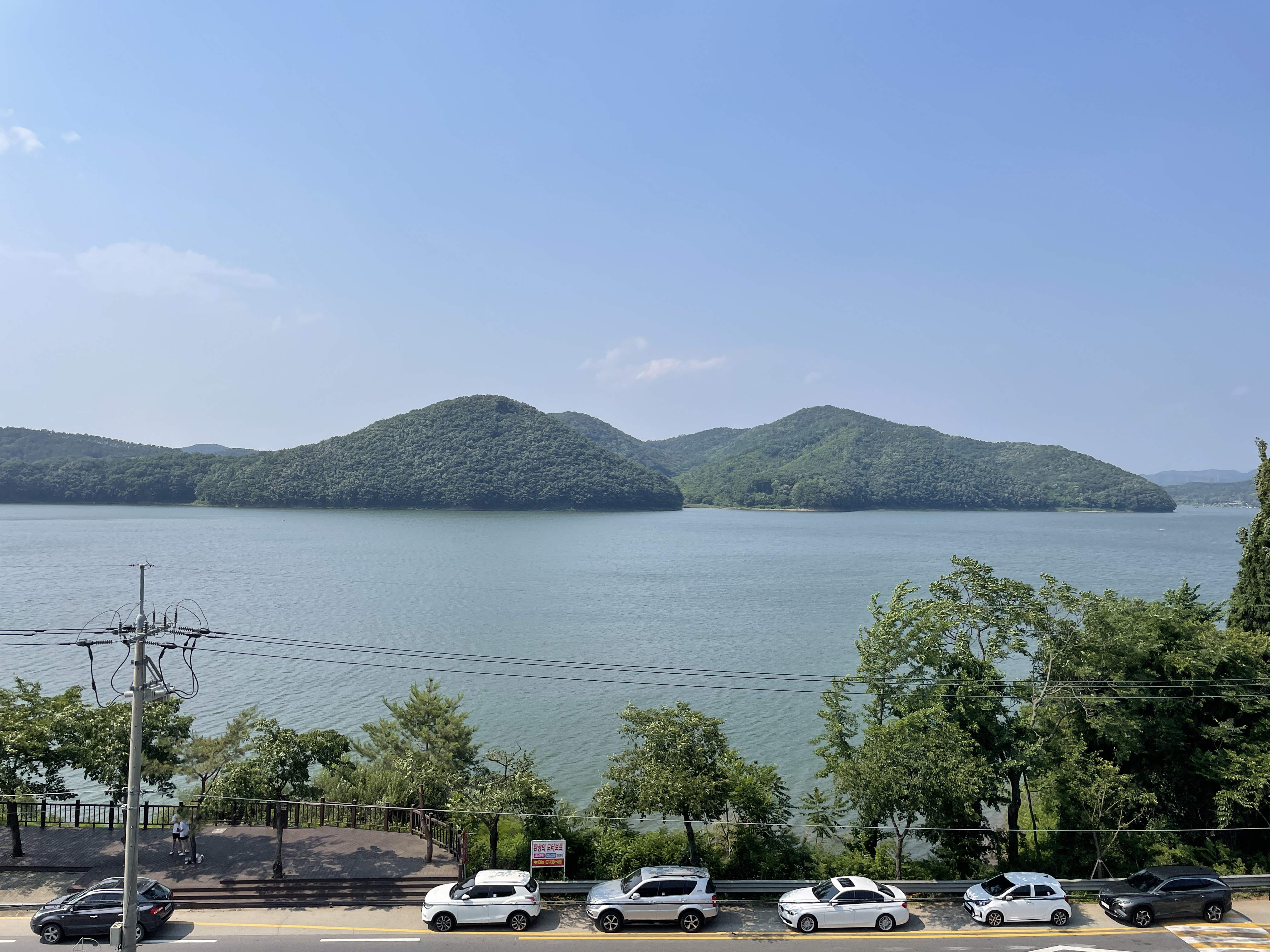 2층 풍경으로 저희는 실내에 있었고 밖을 바라보면 이렇게 이동저수지가 한눈에 보입니다.