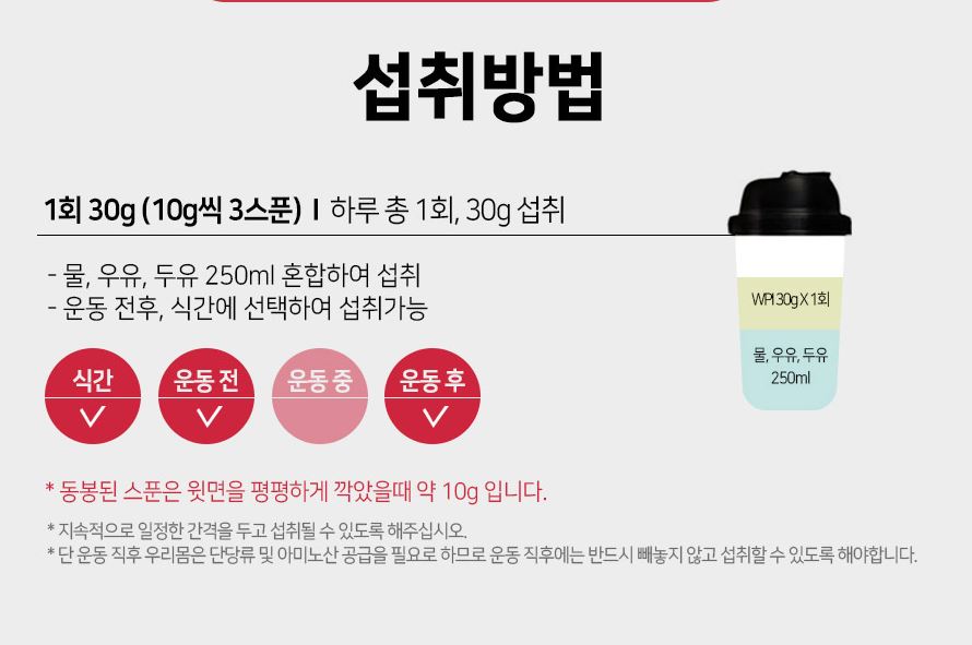 유청 단백질은 다른 보충제에 비하면 흡수가 상당히 빠른 편이라, 영양분을 써서 당장 영양분이 필요한 순간인 기상 직후나 운동 직후에 많이 먹는 편입니다.